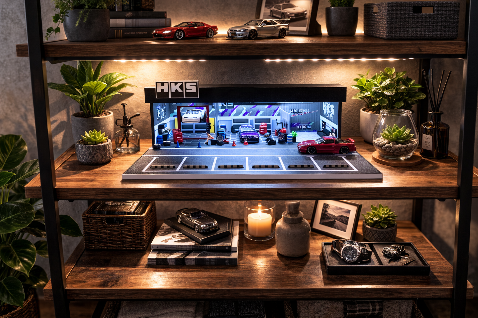 Imagine your favourite 1:64 scale Hot Wheels car, perfectly illuminated within a vibrant diorama garage or showroom.